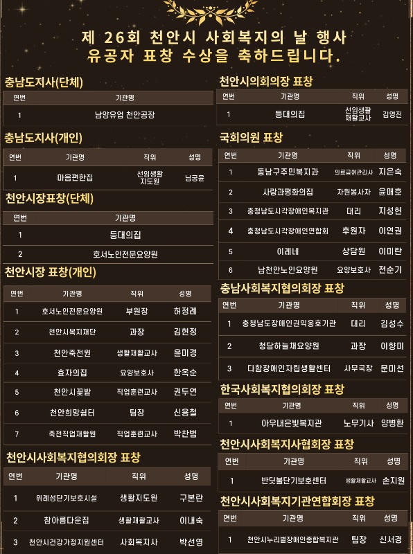 제 26회 천안시사회복지의 날 행사 유공자 표창수상 페이지 정보 작성자작성자 : 천사협 조회조회수 : 430회 작성일작성일 : 25-09-23 13:14 본문 수상을 축하 드립니다! 목록 다음글「제26회 천안시사회복지의 날 행사」사회복지 유공자 추천 협조 요청 25.07.28